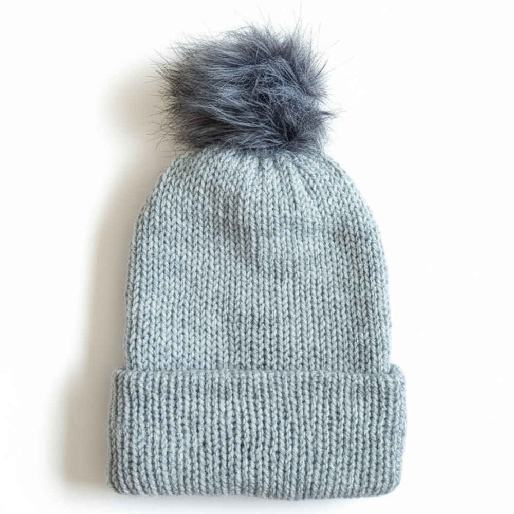 Eine weiche und stylische hellgraue Strickmütze mit einem dunkelgrauen Kunstfell-Bommel für einen eleganten Winterlook. Das dicke Acrylstrick hält dich warm und bequem, während der umgeschlagene Rand für eine feste und gemütliche Passform sorgt. Ein neutrales Accessoire, das sich mühelos mit jedem Winteroutfit kombinieren lässt.