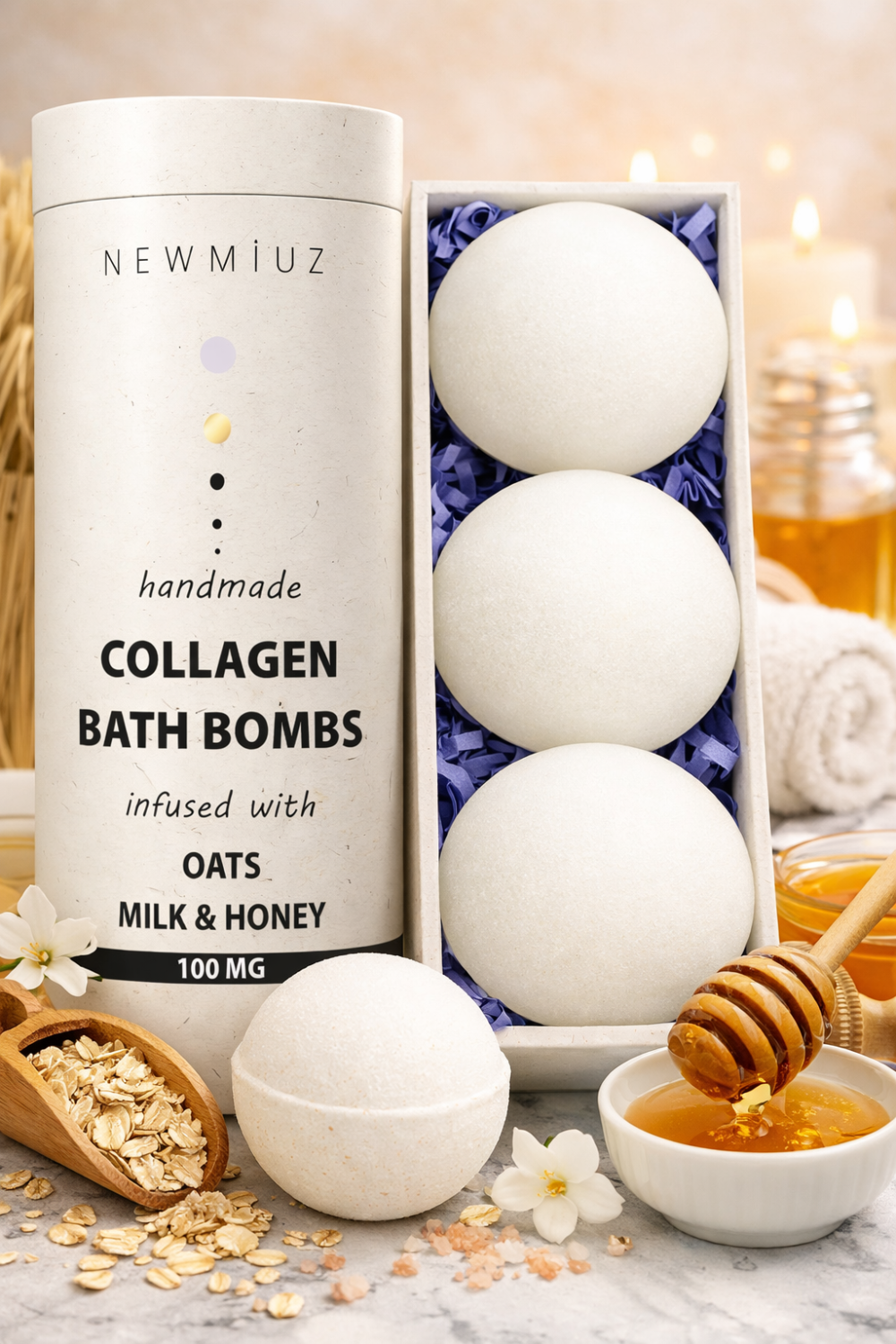 Transform your bath into a relaxing spa experience with these luxurious Collagen Bath Bombs infused with Oats, Milk & Honey. Designed to nourish and hydrate your skin, these handcrafted bath bombs dissolve gently in warm water, releasing soothing ingredients and a comforting aroma.