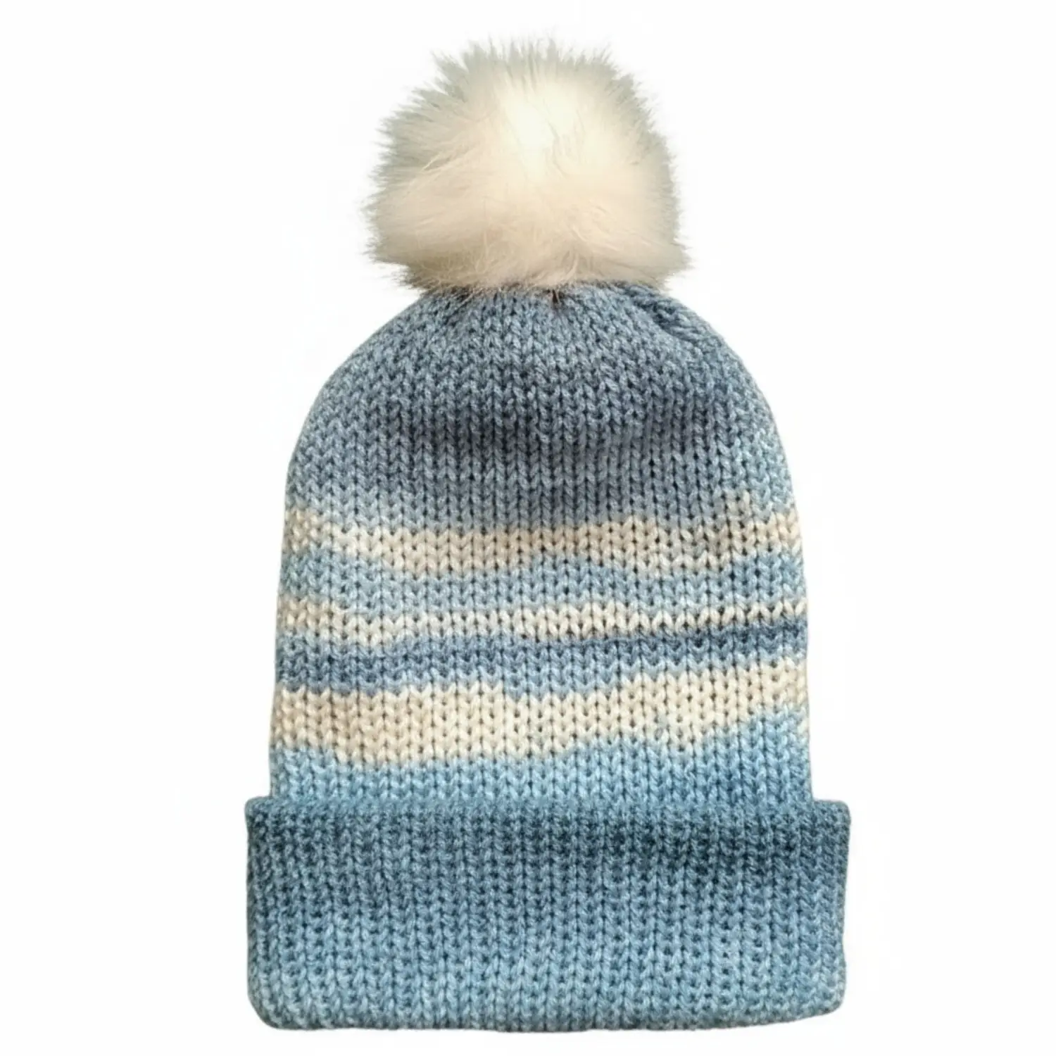 Mīksta un stilīga adītā cepure ar nomierinošu gaiši zilas un krēmkrāsas pārejas rakstu. Pūkainais baltais bumbulis piešķir rotaļīgu un elegantu ziemas noskaņu. Izgatavota no silta, ērta materiāla, šī cepure ir ideāli piemērota aukstām dienām, piedāvājot gan omulību, gan modernu pasteļtoņu izskatu. Lieliski sader ar neitrāliem mēteļiem un šallēm, radot mūžīgu ziemas tēlu.