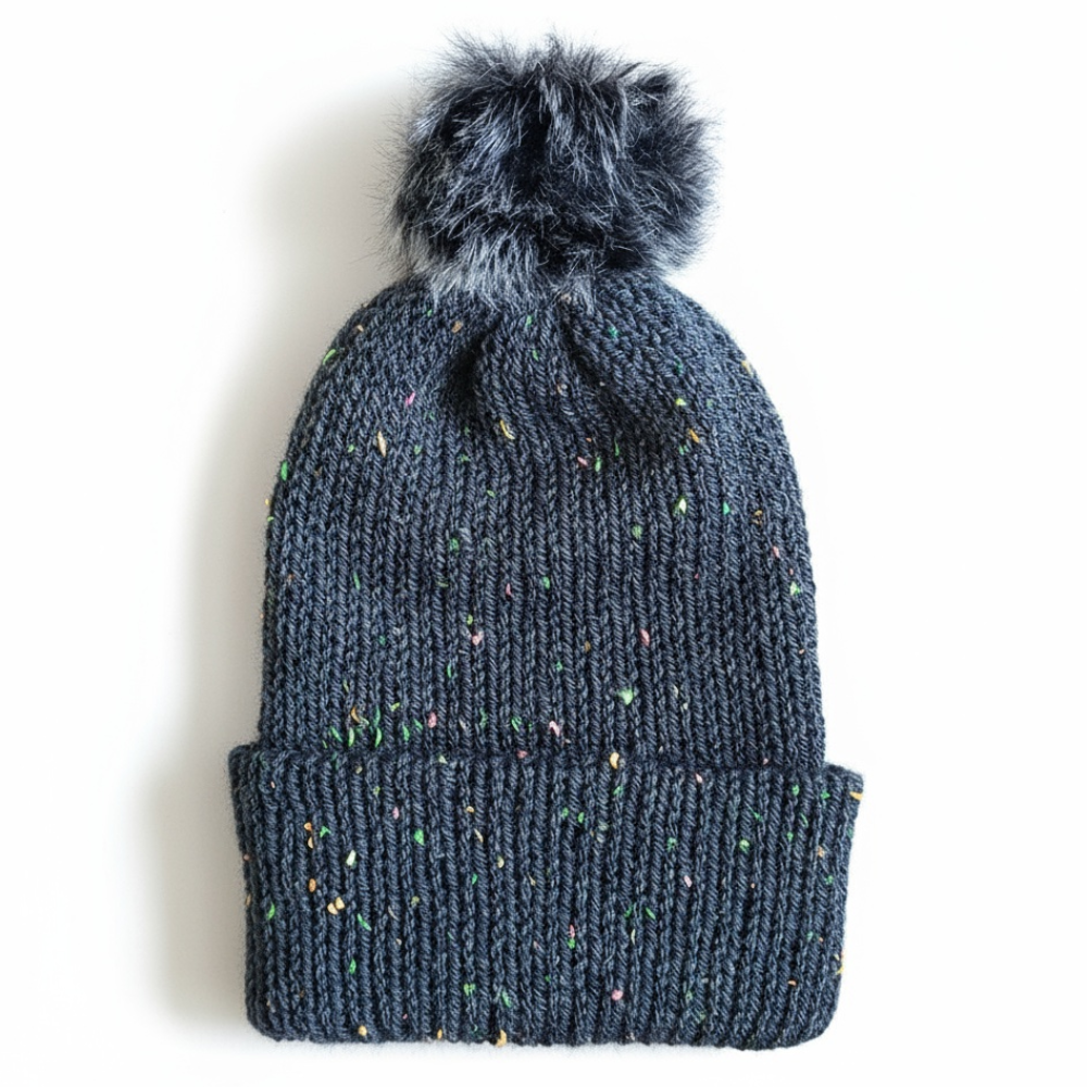 Stylish and cozy, this dark teal knit beanie features colorful speckled threads for a subtle pop of color. The soft faux fur pom in deep gray tones adds a chic finishing touch, while the fold-over brim ensures warmth and comfort. A perfect accessory for winter walks, casual outings, or adding texture to your cold-weather look.